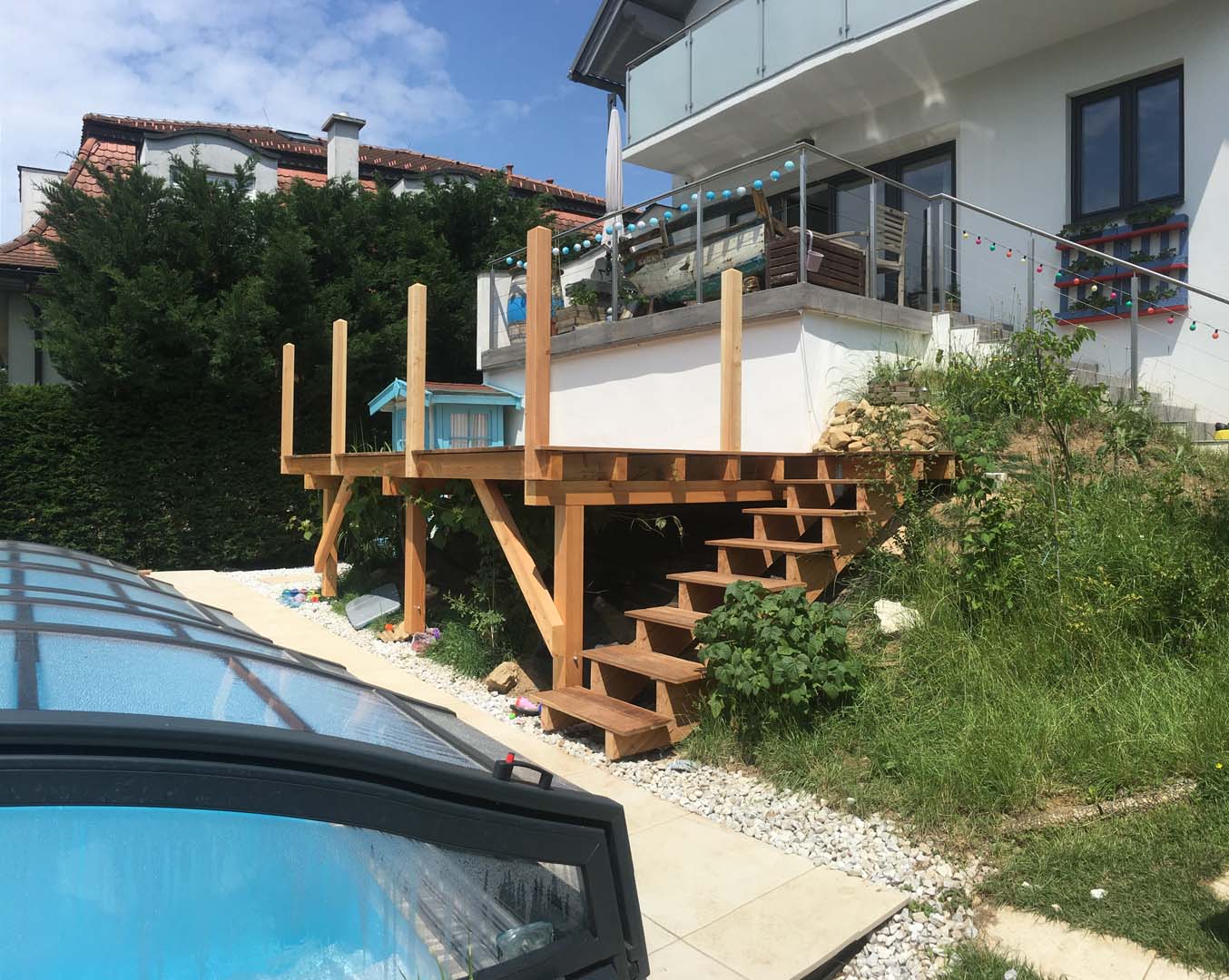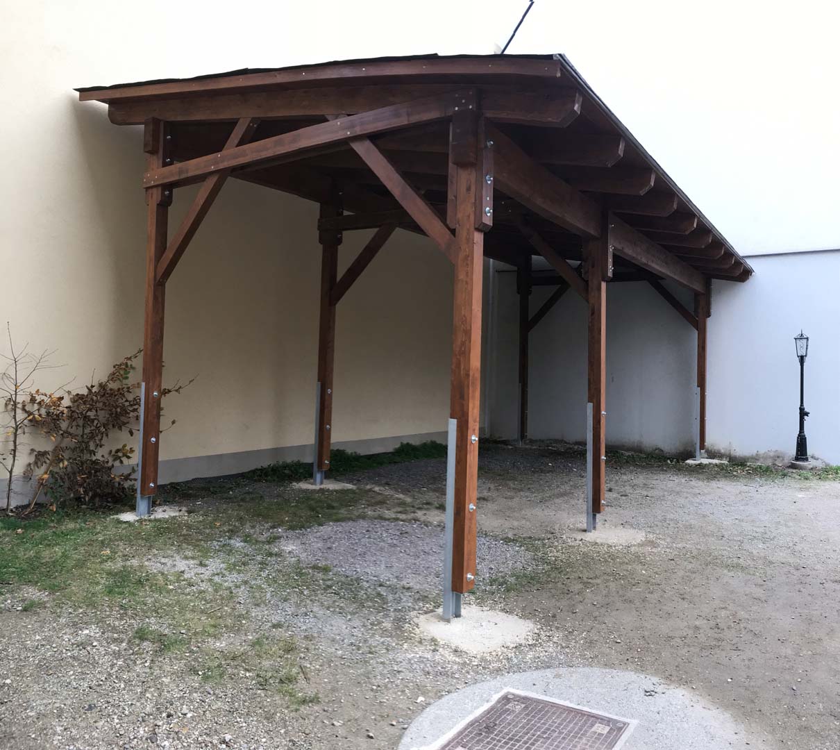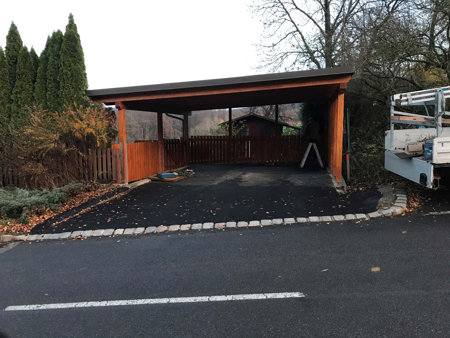 Gartenhäuser, Carports, Gartenzäune, Dachstühle, einfache Stiegen, Ausbesserungs- und Renovierungsarbeiten an allen Holzkonstruktionen, Neueindeckung und Ausbesserung von schadhaften Dachdeckungen sowie Instandsetzungen von Kaminen bis hin zum Dach.