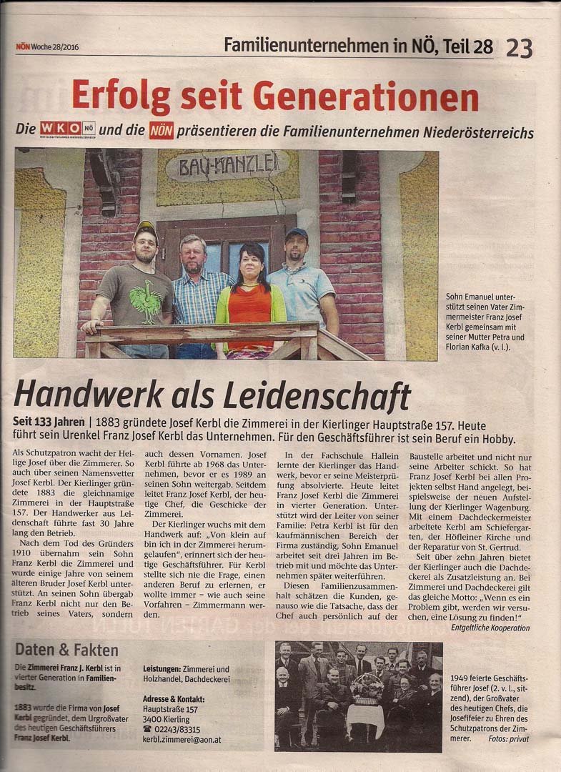 Wir begrüßen Sie herzlich in der Zimmerei Kerbl in Kierling, einem Betrieb mit Tradition. Gegründet wurde unser Unternehmen bereits 1883, heute wird es erfolgreich vom Urenkel Franz Josef Kerbl geführt. Unser Team besteht aus 3 Zimmerern und einer Sekretärin.